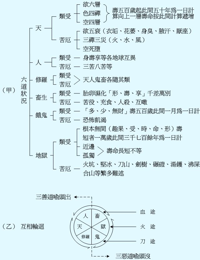 第六講表講「宇宙有情概況」。十四講表每一張表都有它的宗旨,我講出來,你各位才了解。比如說剛才的那一張表「人生三際之抉秘」,是破除凡夫斷滅的知見。所謂斷滅知見就是一般人認為我們人一死了什麼都沒有了,就斷滅了,這一生死了以後,一口氣不來,斷了氣以後,沒有來生了,這叫斷滅的知見。有這個知見的話,他就在這一生,他愛怎麼做就怎麼做,損人利己、貪圖享受,只要自己能力辦得到的,盡量去做,造的惡業,他將來不要負責任,一死就完了嘛,這種知見非常可怕的。有這種知見的話,就是造大惡業了,那將來非墮地獄不可。所以前面這一張表人生三際講三世因果,這個三世因果、十二因緣就破除那個斷見,這是它的宗旨。 現在這一張表就是破除常見的,一般的人有這種常見比較少。外道,在印度那個時候的一般外道,現在世界上也有不少的宗教,現在一般宗教也犯了這種不正的知見。常是什麼呢?常是永久是這樣的。什麼叫作常見呢?一般外道,就是一般宗教,認為人死了以後,他也知道不是死了什麼都沒有了,死了以後還有人,還有生。這個生他之謂常見,為什麼呢?人死了以後還是人,生生世世就是人;畜生呢?死了以後,下一生還是畜生,這就是常見。這個常見,跟佛法所講的六道輪迴不是一樣的,佛教釋迦牟尼佛把六道輪迴這個事實看得清清楚楚的,這是事實,一般外道他就沒有這個知見,他不了解,他看不清楚,所以他是常見。 常見也很可怕的,為什麼呢?比如說,我們人在這個世間,對於那些動物,吃了牛肉、吃了豬肉、吃了羊肉,懂得三世因果的話,這個時候就不敢吃啊。楞嚴經裡邊講:「人死為羊,羊死為人」。我們現在做人,一到冬天吃了涮羊肉,好了這個涮羊肉一吃,吃得口腹之慾可以飽,這是滿足口腹之慾。可是經裡面講的,這一生你吃了涮羊肉,來生你還要到人間來,來生換一換位置了,羊死了以後,他這一生被你吃的話,他再一世來,他到人間來;那麼你再一世的話,就變成羊了,就輪換啦。這種事實外道看不到,外道看不到的時候,所以他就是貪圖口腹之慾,吃了海鮮、吃了山珍海錯,天空上飛的,把牠抓過來,山上野外的鮮味也要把牠網羅過來,海裡也要把牠撈過來,只滿足自己一個口腹這種慾望。想想看這個常見啊,他不害怕的,這還只是對待動物來講的。至於說人對人的話,那些殺人放火的那些事情,當然斷見他也做得出來,常見他也做得出來。很多犯罪的人,要去執行死刑的時候,他常常講:「不要害怕」,自己對自己講或對別人講:「再二十年我又來了」,意思說,再二十年,一死了之後馬上就轉世,又到人間來,再過二十歲,他又是一條好漢,又可以殺人放火了。這種知見,你看,他能夠再來啊?這是邪惡的知見,這種常見、前面那個斷見,就是破除那個邪知邪見,破除邪知邪見的話,對於佛法才能夠入門。 第六表講「宇宙有情概況」。宇宙現在一般就是講時間、空間。時間也是無限長的,空間也是無止境的。在這個無窮無盡的時空之中,六道的眾生就是有情的,有情就是有情識的這些眾生,他們的概況,這一張表是講這個。 先講六道的狀況,此表分成兩大段,一段是講六道狀況,一段是講互相輪迴。先解釋「六道狀況」,六道裡邊最好的就是天道。天道,道是講在那一種生活的環境,在那個當中叫做道。六道裡邊每道眾生都分成為兩項來介紹,一項是「類受」,一項是「苦厄」。類是種類,受是接受苦樂的感受。天 道 先講「天道」的類受,天道的類受啊,普通人講天,一般宗教也講天,一般宗教講天,籠統地只說天,至於什麼樣的天呢,他也說不清楚。在佛法裡面所講的天,就很清楚地告訴我們,一個是欲界天,欲界就是有種種欲望的,所謂種種的欲望最主要有三種。這個三種後邊有講的,在這裡也不妨先說一說,有飲食之欲,我們人間貪吃,吃這個吃那個,在欲界天也有這個;還有男女之欲,欲界天也有;還有我們人有睡眠之欲,沒有睡眠是不行的,在欲界天也有。欲界天有飲食、男女、睡眠三種大欲望,這個叫欲界,這個「欲界有六層天」。色界天,色界就是這個欲望通通沒有了,但是還有形狀、身體,身體就叫做色,有四層,叫四禪天。四層是比較概略地分;詳細地分,四禪天再有十八層,合起來有十八層天。空界,空界就是無色界,這個身體也不要了,那麼一共有四層。這個「色界四禪」、「空界四層」,怎麼樣的條件才能夠升到那個上面去呢?他跟欲界不一樣。欲界天他要做種種的善事情,做什麼樣的善事?做十種善業,十種善業就是跟十種惡業相反的,不做十種惡業,相反的做十種善業,那麼這樣他就可以升到欲界天。色界天當然也要做善業,但是只憑做善業是不夠的,要修禪定了。這種禪定是世間禪定,跟佛家講的出世間禪定,那個出世間禪定要大定,很深的,他這個是比較淺,跟那個不相同,這叫世間禪定,要有禪定的功夫才能夠升到四禪天。空四層天當然也是定功,那也不是普通的禪定了,那是更比禪定功夫再進一步,才能升到四空天。一共有三界,欲、色、空,或者是欲、色、無色,叫三界,這是「類」。 受是包括苦受、樂受,種種的享受。就拿壽命來講,就拿這一個事情來說吧,在天道的眾生,最短的、最起碼的壽命是五百歲,這個五百歲怎麼個計算法的呢?此間就指的我們人間,我們人間五十年就是天上最初的一層天、是它一天,六欲天六層天,第一層天壽命是最短的,最長的就是平均五百歲,可是他這個五百歲,一天