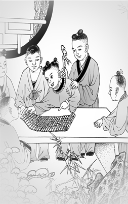 「文學:子游、子夏」,「文學」,古代聖王傳下來的典籍文章,孔子整理為《詩》、《書》、《易》、禮、樂、《春秋》六經。子游,以習禮表現最為突出。《禮記‧檀弓》篇,記載當時卿大夫及士庶人,遇到習禮有疑問時,都會請教子游。子夏,傳承了《詩經》及《易經》,曾經請問《詩經》:「巧笑倩兮,美目盼兮,素以為絢兮,何謂也?」就在問答當中,子夏悟到「禮後乎!」孔子讚嘆子夏能啟發他,可以和子夏深入談論《詩經》了!