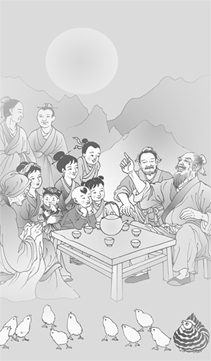 同鄉之人聚會飲酒,年紀六十歲以上,持杖的老者離席出去後,孔子就隨後出去。鄉人舉行驅逐疫鬼──「儺ㄋㄨㄛˊ」的儀式時,孔子也會穿上朝服,站在東邊的阼階上,恭敬接待「儺」的隊伍,與鄉民同樂。