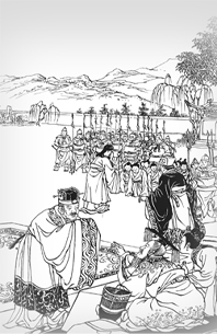 春秋時,鄭國大夫潁考叔,呈獻禮物給鄭莊公,莊公也賜宴款待潁考叔。飲食間,潁考叔把肉夾在旁邊。鄭莊公感到奇怪,就問原因。潁考叔答說:「臣下與家母平常一起進食,尚未吃到國君賞賜的食物。臣下珍惜國君的賞賜,想把肉帶回奉養母親,母親一定會感到光榮無比。」潁考叔的孝心感動了鄭莊公,使他思念起自己的母親,更設法修復母子的裂痕,親情如初。