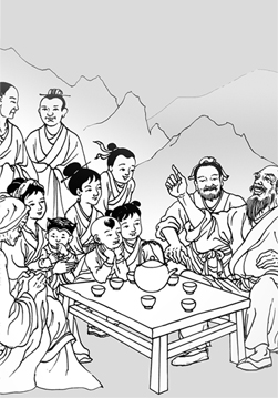 「杖者出,斯出矣。」「杖者」,參加鄉飲酒時,六十歲以上的老人都持有拐杖。當敬老禮儀結束,主人親送老人出門,孔子位為大夫,排在立侍的眾賓之列,隨後才離去,這是序齒不序爵,按年齡排序不按身分地位,尊重鄉中的長者。