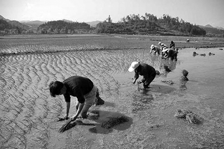 (種田人插秧,低頭便看到水裡的天景,一直後退至最後,一畦的秧苗便已完工。)