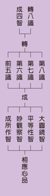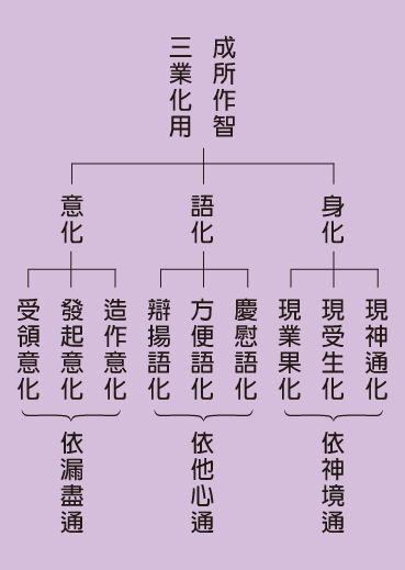 丙、別釋智品 (四)成所作智相應心品 無著菩薩之《大乘莊嚴經論》卷三,及《梁攝論》卷十三,皆悉稱之為「作事智」(作所應作智)。 《成唯識論》卷十云:「成所作智相應心品,謂此心品,為欲利樂有情故,普於十方,示現種種變化三業,成本願力,所應作事。」謂諸佛如來,為欲令一切有情,獲得出離生死輪迴之苦惱,了脫生死之安樂,因而普遍於十方,應機而現三輪不思議化,彌滿法界,利益眾生。即佛之身口意三業,具有摧碾眾生惑業之功能,故稱「三輪」(輪,有摧碾之義): ①神通輪--又名神變輪,即由佛之身業,現種種神變,使眾生起正信者。 ②記心輪--記心者,識別他心也,即以佛之意業,分別他心行(心理活動)之差別者。 ③教誡輪--又名「正教輪」,即以佛之口業,演說教法,令眾生反邪歸正者。 此上三者,如次第為身、意、口之作用。即先以神通啟發他,次以記心鑑知其根機利鈍;後以教誡,隨宜演說,使眾生起行正道。是以《金光明文句記》卷一下云:「身業現化,名神通輪;口業說法,名正教輪,意業鑑機,名記心輪。」 《義林章》卷六云:「又為示現身、意、語三,如其次第,三業化故,不減不增。」謂諸佛如來,以此三業化,成就因地中,所發之大願,所應作之利他事業,畢竟常恆,無有間斷,故名「成所作智」。 《佛地經論》卷六云:「成所作智,應知成立如來化身。」此復三種,如表所示: