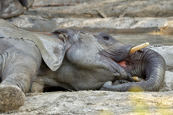 提婆達多心生妒意,用手猛擊大象的額頭,又用腳踢牠的胸口,大象當場倒地死了,正好堵在城門口,誰也搬不動,人群因此壅塞難以行走。