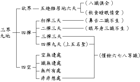 講「世間」,不說遠處。我們都在三界內,什麼叫「三界」?一為「欲界」,有六層天,都有男女、飲食之欲。二為「色界」,有十八層天,又叫「四禪天」;此界眾生因有世間禪的功夫,所以沒有男女飲食,但還有身相。三為「無色界」,此界已沒有色相,只有神識(第六、七、八識);小乘人不知第八識為何物,便不能稱為「世間解」。 賴耶三相