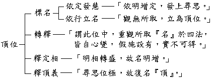 《論》九云:「依明增定,發上尋思,觀無所取,立為頂位,謂此位中,重觀所取『名』等四法,皆自心變,假施設有,實不可得,明相轉盛,故名『明增』,尋思位極,故復名『頂』。」