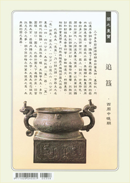 三千多年前商周時期由於尊鬼神、重祭祀,所以運用青銅合金,鑄造了貴重的禮器。所使用的器皿無論是食器、酒器或水器,其種類和數量因使用者的身分地位而有不同。器上「銘文」亦是特色,開始於商代,入周後更廣泛使用,常以長篇銘文鑄器記事,如紀錄諸侯分封、各種祭祀宴饗、抗敵征討和對祖先追崇景仰等,皆稀世遺文,邦國重器。相較於書策簡帛,則能減緩歲月摧殘而歷久保存。 |