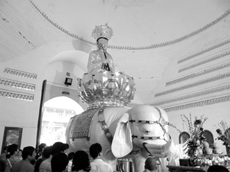 峨眉山位於四川盆地西南邊,往青康藏高原的過渡地帶。主峰為金頂,最高峰萬佛頂,海拔三0九九公尺。因為兩山相峙如兩道眉毛,所以諧音「峨眉」。既然滿山盡是聖人足跡,不想只在山底下的報國寺晃晃就走了,或是直達金頂瞭望一番便西下峨眉峰。一行人先上到山腰,參訪峨眉最著名的古剎萬年寺,禮拜無樑殿騎象的普賢菩薩銅像。一千多年前,這尊重達六十二噸的銅像鑄成後,靠什麼技術運到山上安放,至今還是一個謎團。