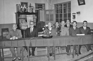 早年,苑老居士(後排右起第一人)。跟隨雪公及諸師長,列席各項弘法活動。