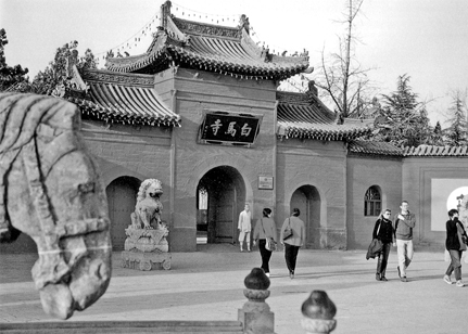 明帝大喜,於是下詔派遣郎中蔡愔、中郎將秦景、博士王遵等十八人,往天竺訪求佛道。漢永平十年,於西域遇迦葉摩騰、竺法蘭二位尊者,攜梵本經、舍利及畫佛像,以白馬載運抵達洛陽。永平十一年,漢明帝於洛陽城外建白馬精舍,這是中國最初有伽藍寺院之始,二位尊者便於此翻譯出《四十二章經》。