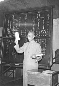 (雪公在正因蓮社講演,仿效學校教學方式,穿便服,用黑板。)