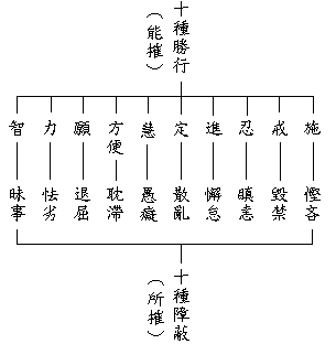 故《普賢行願品》偈頌云:「勤修清淨波羅蜜,恆不忘失菩提心,滅除障垢無有餘,一切妙行皆成就」,謂修習位菩薩,恆不忘失無上菩提心,勇猛精進修學布施等十種波羅蜜,一一皆三輪清淨,以「輪」有摧壞之義故,菩薩能以十種勝行,摧壞十種障蔽無有剩餘。今依《別行疏鈔》四,列表如下: