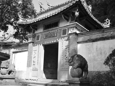該門興建於日據時期大正五年(民國五年),造型古樸素雅,距今已九十四年,遭逢幾次大地震皆未受損。且看門上此聯,不僅對仗工整,且書法、刻工皆蒼勁有力、清新脫俗,反復吟詠,至感前人悟境之高遠。