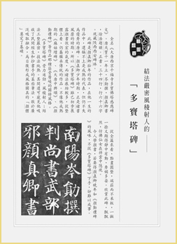 《多寶塔碑》骨力遒勁,風稜射人;結法工整嚴密,技法純熟。其間還可窺見他吸收了民間經生和抄書手的某些筆法,敢於廣泛吸取融合,為日後形成風格獨具的「顏體」奠定了基礎。