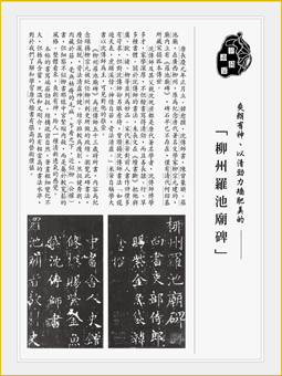 《柳州羅池廟碑》為沈傳師五十三歲時所書,內容為紀念頌揚柳宗元被貶任柳州刺史所做的政績。瀏覽此碑書法,瘦勁灑脫,骨法清虛神健。結字雖較為瘦削,然挺健秀朗,肉藏於筋,毫無枯瘠的毛病。乍看之下,近似柳(公權)書,但細察不似柳書那樣中宮緊縮內斂,而是屬於較寬鬆的風格。整體看來,爽朗有神,給人一種清新透氣的感覺。