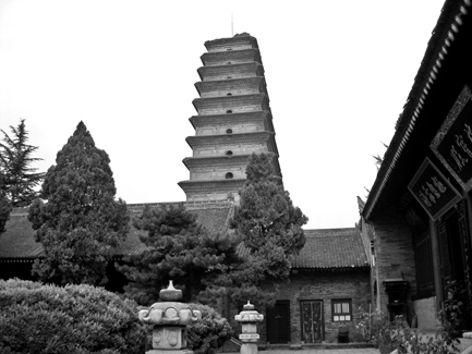 西塔院為善導塔,密檐式磚塔,底層塔身很高,向上各層愈加低矮,簷與簷之間不設門窗。塔身往上漸漸收縮,形成美好的輪廓曲線。善導塔仿木正方形結構,高三十三米,原為十三級。明末,關中大地震,塔頂震毀,現存十一級。塔身刻有《金剛般若波羅蜜經》全文,字跡至今仍清晰可辨。可惜我們只在塔外繞塔念佛,無緣親見內部莊嚴。塔身四周保存十二尊石雕佛像,塔底層四面有門,南門楣額嵌有磚刻「涅槃盛事」橫額,為清乾隆年間修葺善導塔時所建。