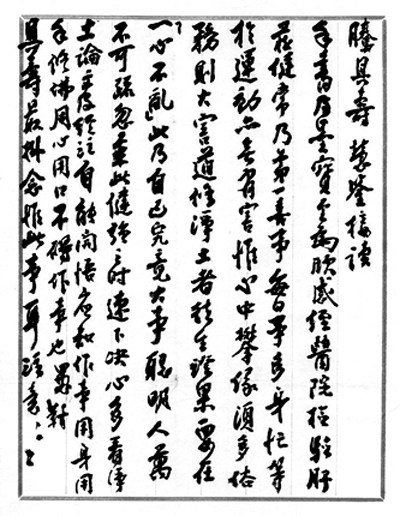 手書及墨寶,至為欣感。經醫院檢驗,肝臟健常,乃第一喜事。每日事多身忙,等於運動,亦無有害。惟心中攀緣須多俗務,則大害道。