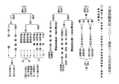 請看(甲)化法四教,這是佛為眾生開的藥。眾生有什麼病呢?主要是妄想執著,就是有迷惑、煩惱。因為有迷惑、煩惱,所以就有輪迴、生死,一個是因,一個是果。