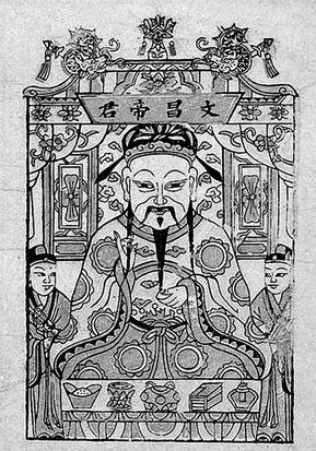 (書生夢見名字已登天榜,忽然被文昌帝君勾去。書生流淚拜禱,帝君三次命他退下。) |