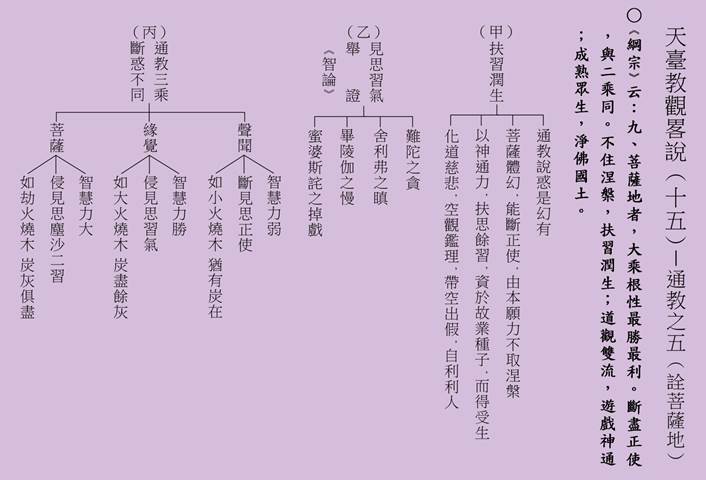 通教「扶習潤生」的概念,以下用(甲)表進一步分析:藏教的菩薩乘沒有斷惑,三大阿僧祇劫都只有伏惑,所以見思惑還在,這樣才能夠滋潤生死、倒駕慈航。在藏教的教理中,見思惑是潤生的因緣,若無見思惑即無法受生,所以他斷不得;至於通教,他斷了惑,該如何來受生呢?他留下見思惑的習氣,用誓願力扶起習氣。若是別、圓二教,受生之緣又不同。別、圓二教已詮釋到中道實相之理,所以別圓二教的菩薩證到中道時便有法身。 諸位都聽過佛有三身─法身、報身、化身。法身盡虛空、遍法界,是真如本性;報身是真實果報身,即如〈讚佛偈〉中所云:「白毫宛轉五須彌,紺目澄清四大海」,無量無邊相好莊嚴;何謂化身?隨著六道眾生的形貌而變化,但具足三十二相、八十種好。三身以法身為本,證到中道就有法身,有法身就可以隨緣感應而化現報身或化身,就像月亮高懸在天上,千江有水千江月,能應現到地面每一條的河川上。 通教與藏教同屬界內教,尚未詮釋到中道實相,所以必得要有見思惑的正使或習氣,作為受身的因緣。一個是「留惑」,一個是「扶習」,二者並不相同。通教說惑是「幻有」,即見思惑如幻如化,即便四諦(苦集滅道)也是如幻如化;既然如此,與 通教人以體空觀,體達一切法如幻如化,「能斷正使」,觀行力一到的時候,就發真無漏,斷見思的正使,把本惑斷除。此時可入涅槃,但他不入,為什麼呢?「由本願力不取涅槃」。他學佛的時候心量大,曾發菩提心,誓願要自利利他,所以就「以神通力,扶思餘習」,斷了見思惑,有了種種神通的力量,就扶起思惑剩下來的習氣。以習氣「資於故業種子」,來幫助過去曾經造的業種子,「而得受生」,而有受生的因緣。 吾人應知,通教菩薩的受生,最重要的其實是他的本願力,正因有本願力,他才可入涅槃而不入,而以神通力扶起思惑的餘習,去滋潤過去的業種子而投胎。所以他是隨著願力而來,自由自在,與一般凡夫隨業受報不同;吾人是被生死束縛住,而菩薩是「道觀雙流」。「道」是「化道慈悲」,慈是與樂、悲是拔苦,他是以此來度化眾生;而「觀」是「空觀鑑理」,同時他又修體空觀,觀照真諦之理。「鑑」就是時時刻刻地觀照,不離開真諦之理。所以他是「帶空出假」,已經證到真諦理(空),帶著空出假,出來做一些度化眾生的事情(假)。這就是遊戲神通,「遊」各個世間,想到哪兒就到哪兒;「戲」,就好像演戲一樣,他的生死是來演戲的,可以示現種種神通變化。 (圖說:菩薩以自己的是願力,扶起遺留下來的見思習氣,以此來滋潤生死,又投胎到三界裡頭來。) 他的目的是要「成熟眾生,淨佛國土」。何謂「成熟眾生」?佛菩薩度化眾生離不開三個歷程─種、熟、脫,「種」就是種善根,有了善根進一步讓它成「熟」,已經成熟的時候,最後令他得解「脫」,即了生死、成佛道。像這樣「種、熟、脫」,不斷的利益眾生。這裡簡單說「成熟眾生」,就是讓眾生的善根成熟,能夠了生死。「成熟眾生」是利益眼前,「淨佛國土」是利益未來,莊嚴、清淨自己的佛國土。所以菩薩行六度萬行,攝持眾生時,其實也就是在利己,以一切諸行通通都是菩薩在莊嚴清淨佛土之行。 所以《維摩詰經》裡說:「菩薩行布施,布施是菩薩的淨土」。為什麼布施是菩薩的淨土?因為菩薩成佛的時候,所有能夠捨的眾生,通通來生其國,所以他這一國土的眾生,大家都很能捨。何以故?因為是菩薩行布施度時召感來的;乃至「持戒是菩薩的淨土」,菩薩成佛的時候,所有持戒精嚴,行十善滿願的眾生,都生到他的國土裡來。所以他一方面在莊嚴未來成佛時的淨土,一方面也是為了利益眾生,故云「成熟眾生,淨佛國土」。 無論藏教或是通教,都會提到見思惑的正使與習氣。習氣是什麼呢?以下舉證《大智度論》的事例讓大家了解。見思惑的正使是貪、瞋、癡等煩惱,貪、瞋、癡來的時候就會起惑造業,造業就是落下業種子,將來會隨業受報。 習氣就不同,「非貪似貪」,例如貪其實已經斷除,但是流露出來的卻好像是貪;「非瞋似瞋」,已經斷除瞋煩惱,不會發脾氣了,但是流露出來的卻好像還有脾氣。那是什麼呢?是正使斷了,但習氣還在,就好像木頭已經燒了,但是還有木炭,再點火還會發紅、燙人,假如燒成一團灰燼,再怎麼摸也不會燙了,所以修行得進一步侵破習氣。跟諸位說,既然灰燼還在,就還是有那個影子,更進一步是連灰也不要了,所謂「炭灰俱盡」,這樣斷煩惱就更徹底了。 接著看表。《大智度論》中所說的「難陀之貪」,難陀是指孫陀羅難陀,他是釋迦牟尼佛的親弟弟,也是淨飯王的兒子,只是同父異母。弟子當中儀容第一,非常莊嚴,所以有的時候會被誤認為是釋迦牟尼佛。釋迦牟尼佛身長一丈六,他是一丈五尺四寸,只矮了六寸,表面上看不出來。佛有三十二相,他則具足三十相,缺了白毫相、兩耳垂肩相。他的太太是孫陀羅,所以稱他為孫陀羅難陀。他的太太也非常莊嚴,兩個人在出家前十分恩愛。 釋迦牟尼佛成道後,看到弟弟還沒出家,自己不能總是只度其他人,所以運用種種善巧方便,讓難陀也出家了。剛出家的時候,他都忘不了太太,所以有時候會偷跑回家,經過佛的勸誡,用了種種的方便,如曾運用神通化現孫陀羅的死相讓他看,最後才斷了他的貪愛煩惱,後來證得阿羅漢果。 但在經論裡記載,難陀還有一點貪的習氣,如果在有男眾、女眾的大眾中坐,他都會先看女眾一下,跟女眾談