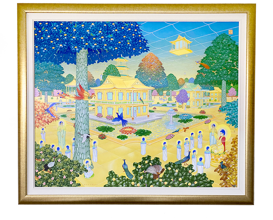 末學帶來親手繪畫的《極樂勝境圖》,她老人家看了特別喜歡。手指著畫裡眾寶鳥和聖眾、菩薩、佛,說:「好美!我很喜歡。」望著末學說:「你畫好了哦?」「是的。」末學指著圖畫一一介紹:「黃金地上、七寶樓閣、私人浴池,白銀水臺上摩尼寶珠,湧出甘露水,流泄而下注入寶池,池中各色寶蓮盛開,散發著光明。高大聳立的七寶樹,上有寶羅網和飛行的宮殿,中有寶鳥飛翔,下有阿彌陀佛及諸大菩薩說法。萬物妍麗光淨,無有日月。極樂聖眾身相如佛,金剛之身,壽命無量。具足神通於一念間,遍於十方世界供養諸佛,一食頃還到本國。於林下花間自在修行,身心自然淨化,定慧不斷增長,畢竟成佛廣度眾生。」