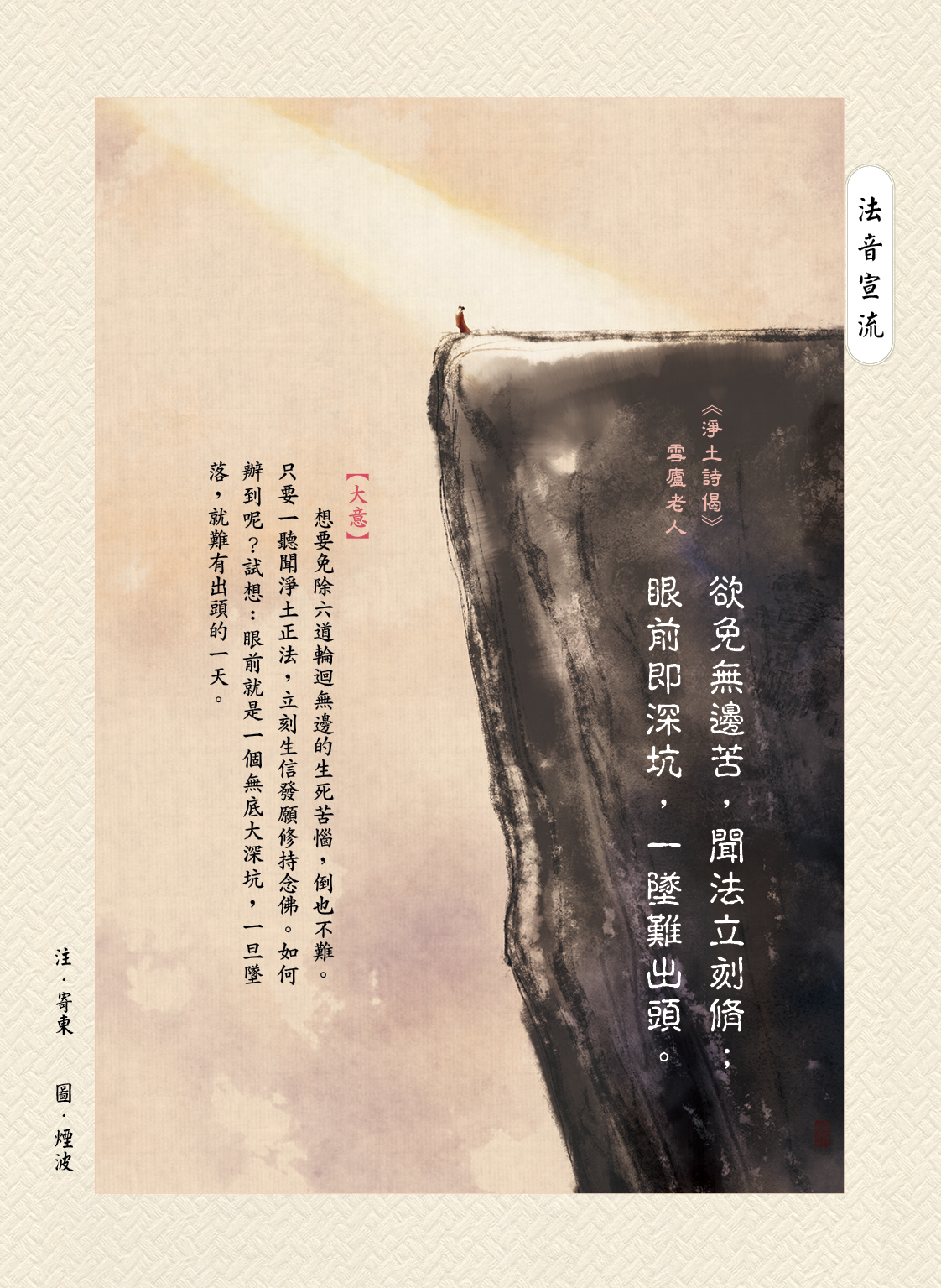 想要免除六道輪迴無邊的生死苦惱,倒也不難。只要一聽聞淨土正法,立刻生信發願修持念佛。如何辦到呢?試想:眼前就是一個無底大深坑,一旦墜落,就難有出頭的一天。