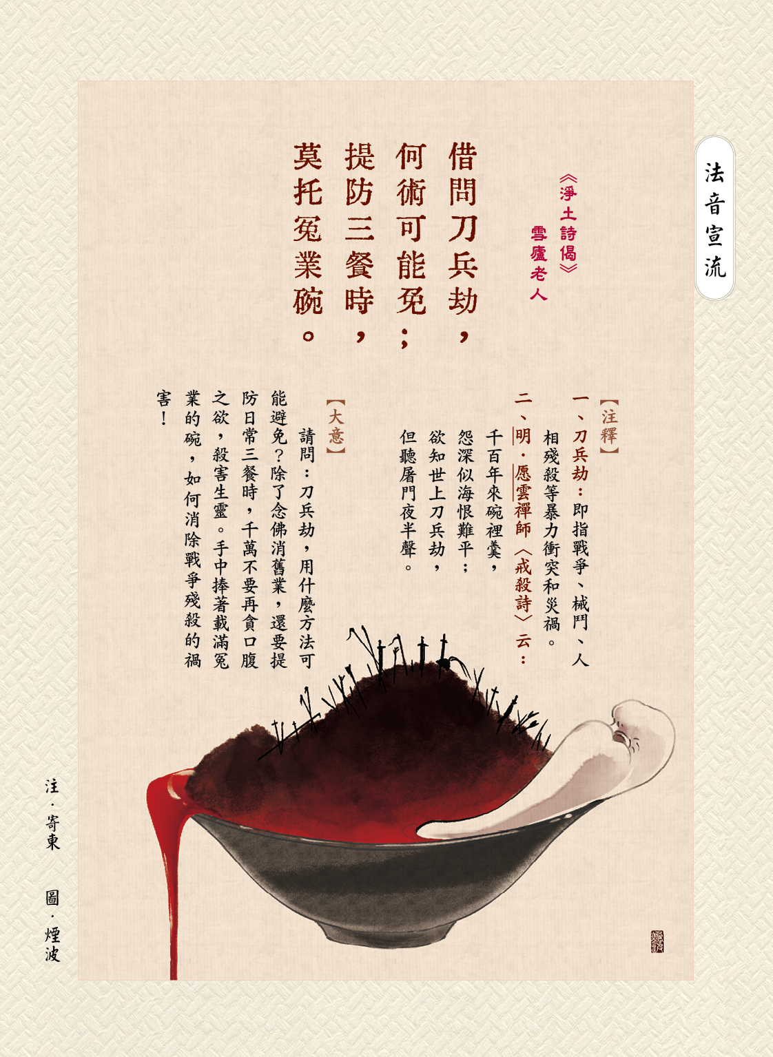 請問:刀兵劫,用什麼方法可能避免?除了念佛消舊業,還要提防日常三餐時,千萬不要再貪口腹之欲,殺害生靈。手中捧著載滿冤業的碗,如何消除戰爭殘殺的禍害!