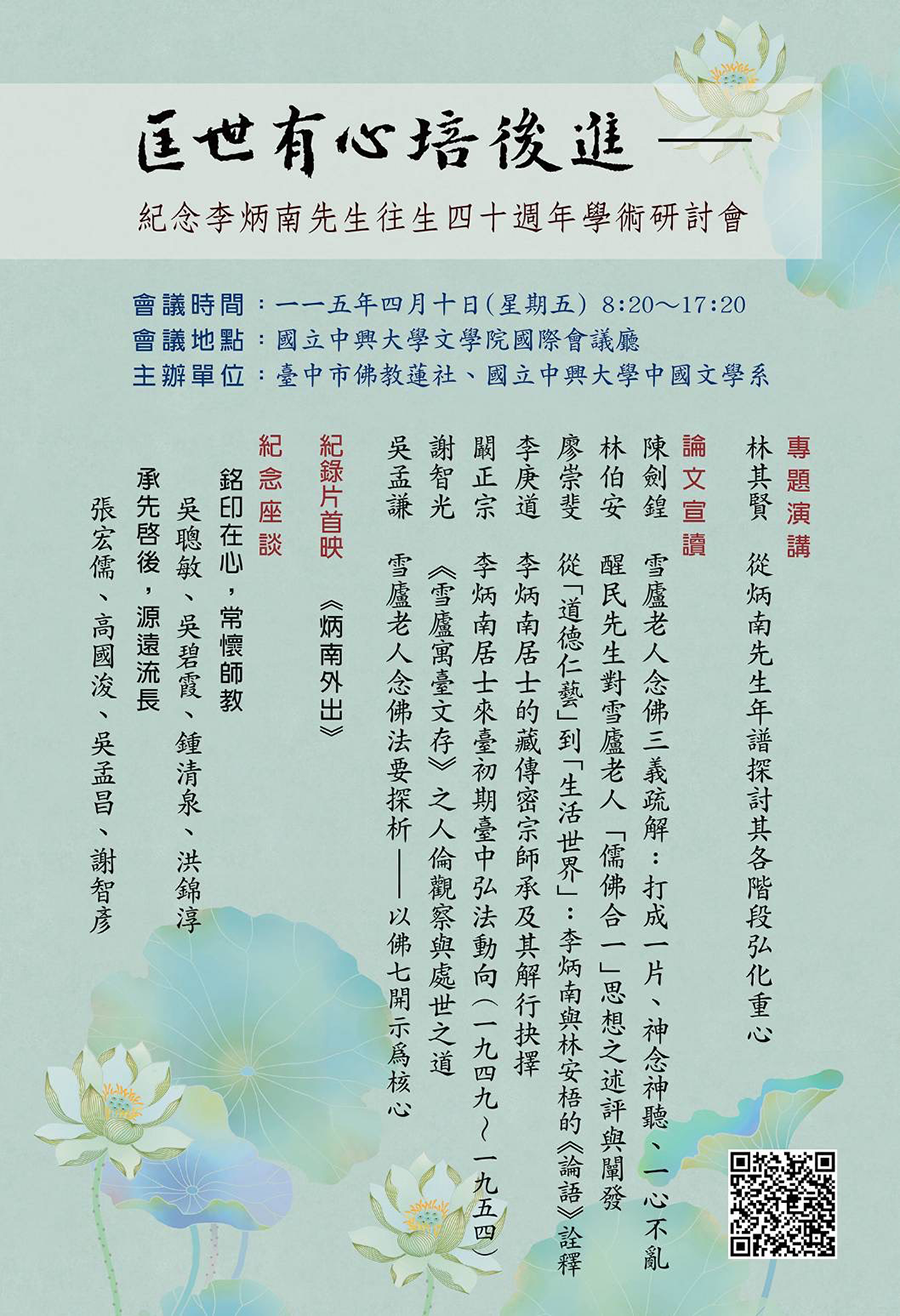 四月十日先與中興大學合作舉行「匡世有心培後進—紀念李炳南先生往生四十週年學術研討會」,在該校國際會議廳舉行,由《李炳南居士年譜》的編著者林其賢教授,發表主題演說;並邀得七位學有專精的青壯學者,宣讀論文,發表對炳南先生學思行誼的精闢研究。此外,李中旺導演團隊,以誠摯發心,十多年蒐集資料,由蓮社組成編審小組協力,歷經三年精製,完成敘述性寫意紀錄片《炳南外出》,將於現場首映。後半場,則由親近雪公受學,復紹續遺志的門生,吳希仁、吳省常老師等人,各自追憶老師身教言教,與躬身踐履師訓的心得。